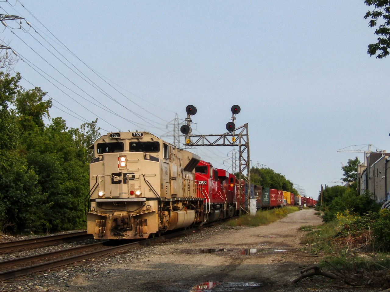 Caption: CP 421-15 powers up after briefly holding for a GO train to clear the Davenport diamond before continuing its journey westbound through Toronto towards the CP Mactier sub. CP 421 had an extra special consist, with CP 7021 leading CP SD60M 6259 and ES44AC 9359. Although it looks like I got a bit screwed by the clouds, this photo was actually taken on a sunny day. The reason for the "dimmed" light, is the smoke from the west coast wildfires had blown across the continent and made it's way to Ontario. Luckily, the smoke was high enough in the atmosphere to not affect the air quality, but it is both fascinating and worrying how much it can affect the amount of sunlight that reaches us.