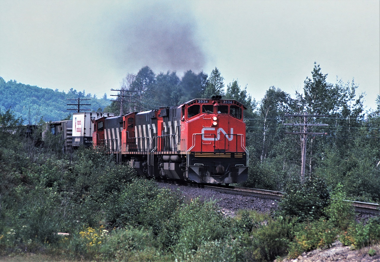 Caption: CN train 214 heads east out of Capreol, Ontario on the now abandoned Alderdale Subdivision with an all MLW power consist: 2534-2519-2500 and 74 loads 3 empties 5585 tons. The train is shown approaching the Ella Lake road crossing.