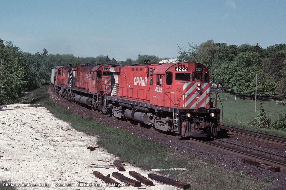 Caption: Heading downgrade, 2'nd 508 has an all MLW consist on this sunny morning in 1990 at Tremaine Road, now closed. Units are CP C424 4222, M630 4555, and a trailing C424.
