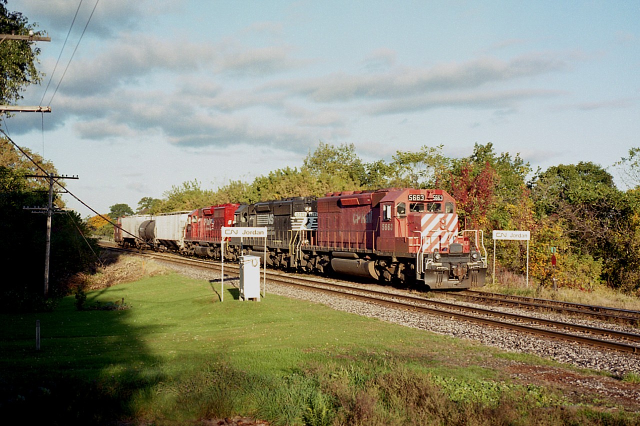 Caption: Really nice early morning, as you can see; the sun is around to the south side of the tracks already as the daily NS auto parts train from Talbotville to Buffalo makes its' way thru Jordan. This combination of colour was most often recorded, a CP-NS mix.