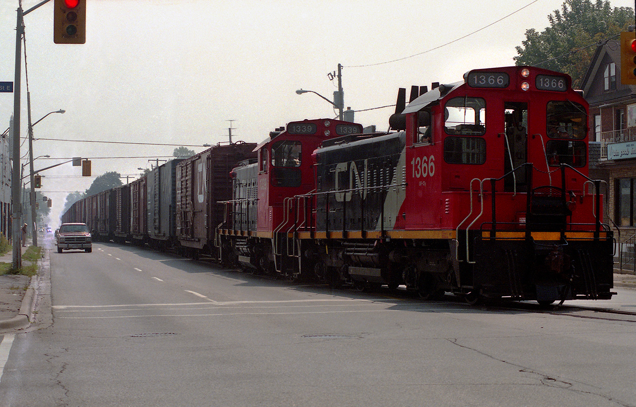 Caption: Running north on Ritson Road, mile 1.9 of the Oshawa Railway, SW1200RS 1366 and 1339 run the red light at Bond Street as they approach the General Motors North Plant. Unfortunately, I didn't note the date I shot the photo, but the rails were removed in 1998.