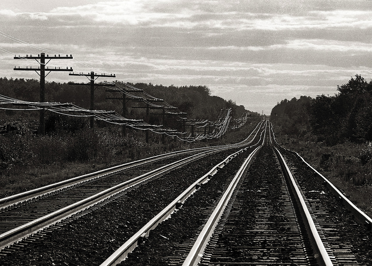 Caption: The rolling countryside looking west along the Kingston Subdivision near Wesleyville, approximately mile 276. The old jointed rail has recently been replaced by continuous welded rail on the north track.