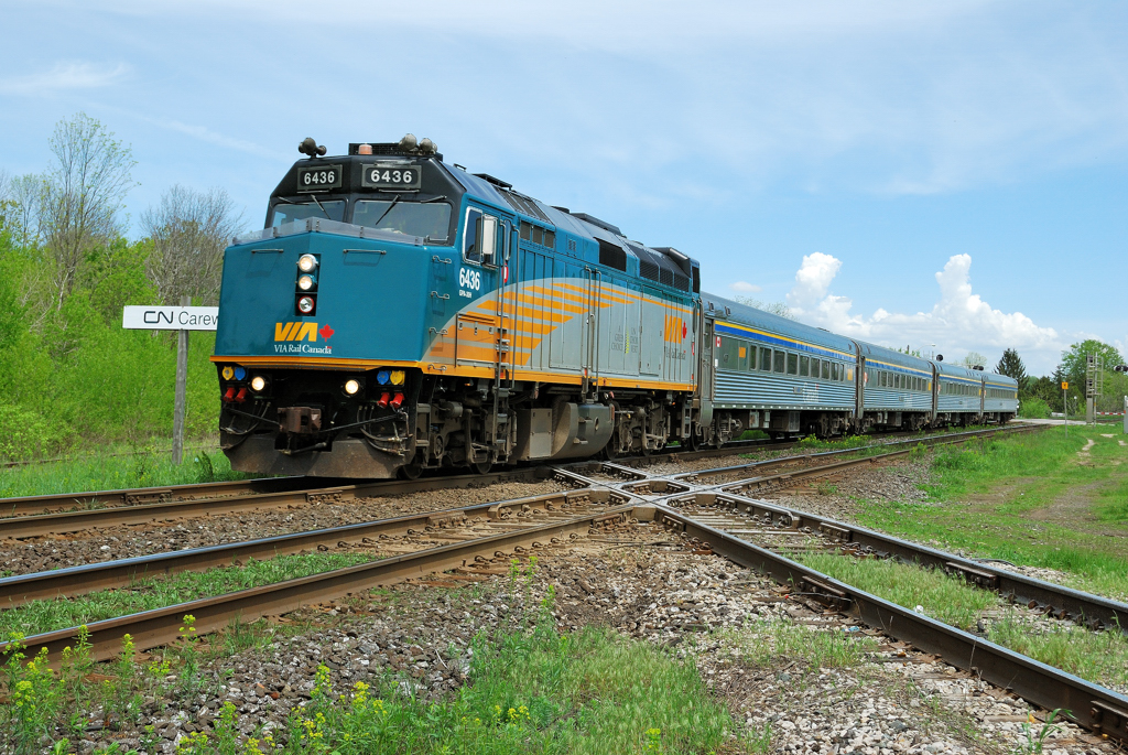 Caption: VIA 6436 pulls 4 Budd coaches across the diamond at Carew