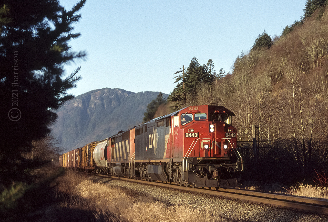 Caption: CN 2443 and 5506 are eastbound at Arnold - CN Yale Sub.