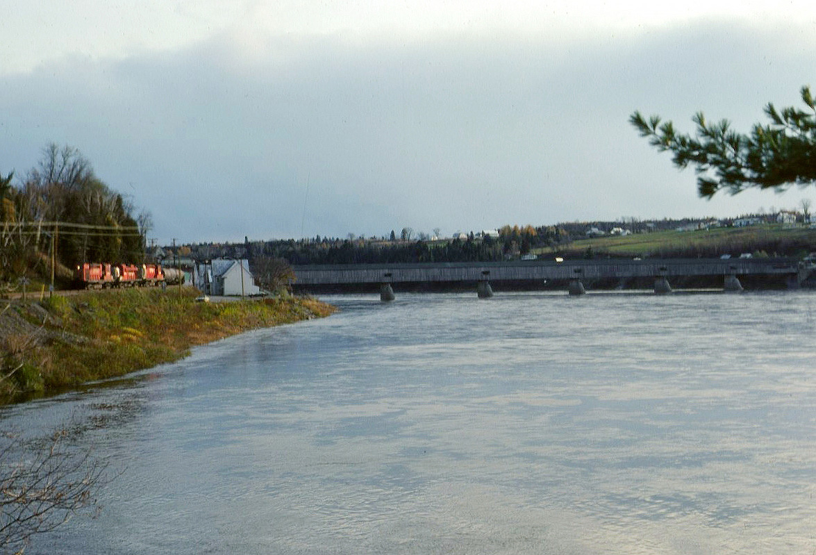 On Saturday, October 23, 1976, I followed the detouring train from my home in South Devon taking photographs at various locations. One of my favourites was this image approaching Becaguimec Stream just north of Hartland. The Hartland covered bridge - the longest in the world - appears in the background. The orange car in the centre of the picture shows one of a large number of insulated San Luis Central cars that would be set off for potato loading at many locations between Florenceville and Grand Falls.