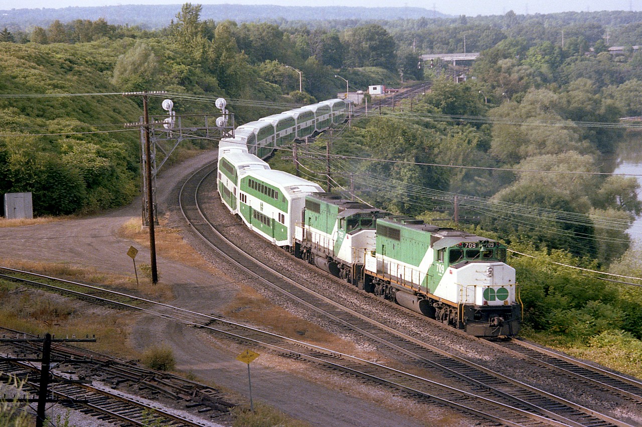 Caption: While looking over this photo, I found it so hard to believe that these two GO locomotives, 709 and 702; became part of the CN fleet 30 years ago already, (CN 9676 and 9671) Trailing is APCU 903, formerly ONR's FP7A 1512. I liked the angle here but often chose a different location due to all those wires cluttering up the scene.