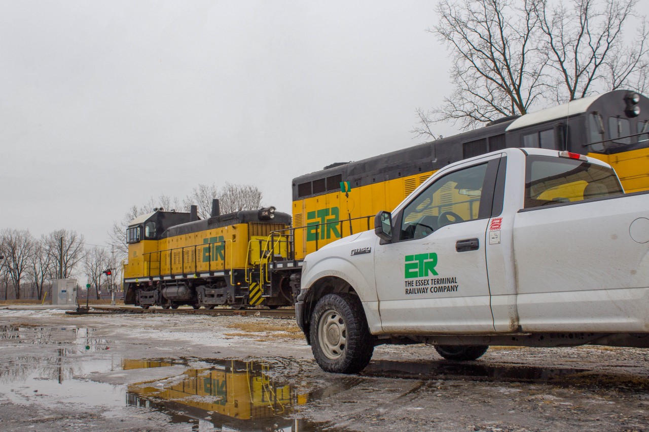 ETR 104 works the Cp electric Yard in Windsor with the Essex Terminal Railway truck standing guard.