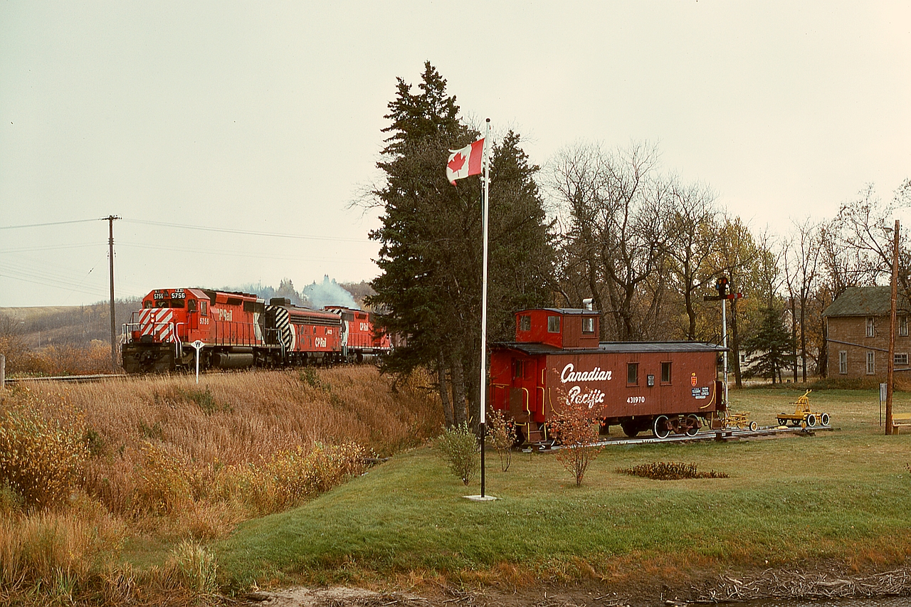 Caption: At Minnedosa, MB, where CP’s Minnedosa subdivision from the south joins to the Bredenbury sub. to the west, timetable train No. 977 with SD40-2 5756 and F7B 4439 and SD40 5514 is passing an early railway history display of caboose CP 431970 just before crossing the Little Saskatchewan River then Main Street. Since then, CP FP7 4038 in maroon/grey with block lettering has joined the caboose in that display.