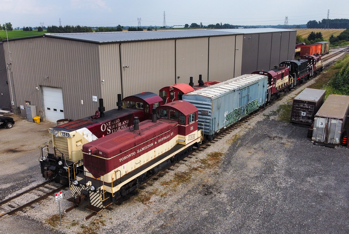 Caption: The latest unit to be repainted in OSR's cream and maroon scheme, OSR 1245 has pulled up beside TH&B 51 at the Salford shops making for a nice comparison between the two units.