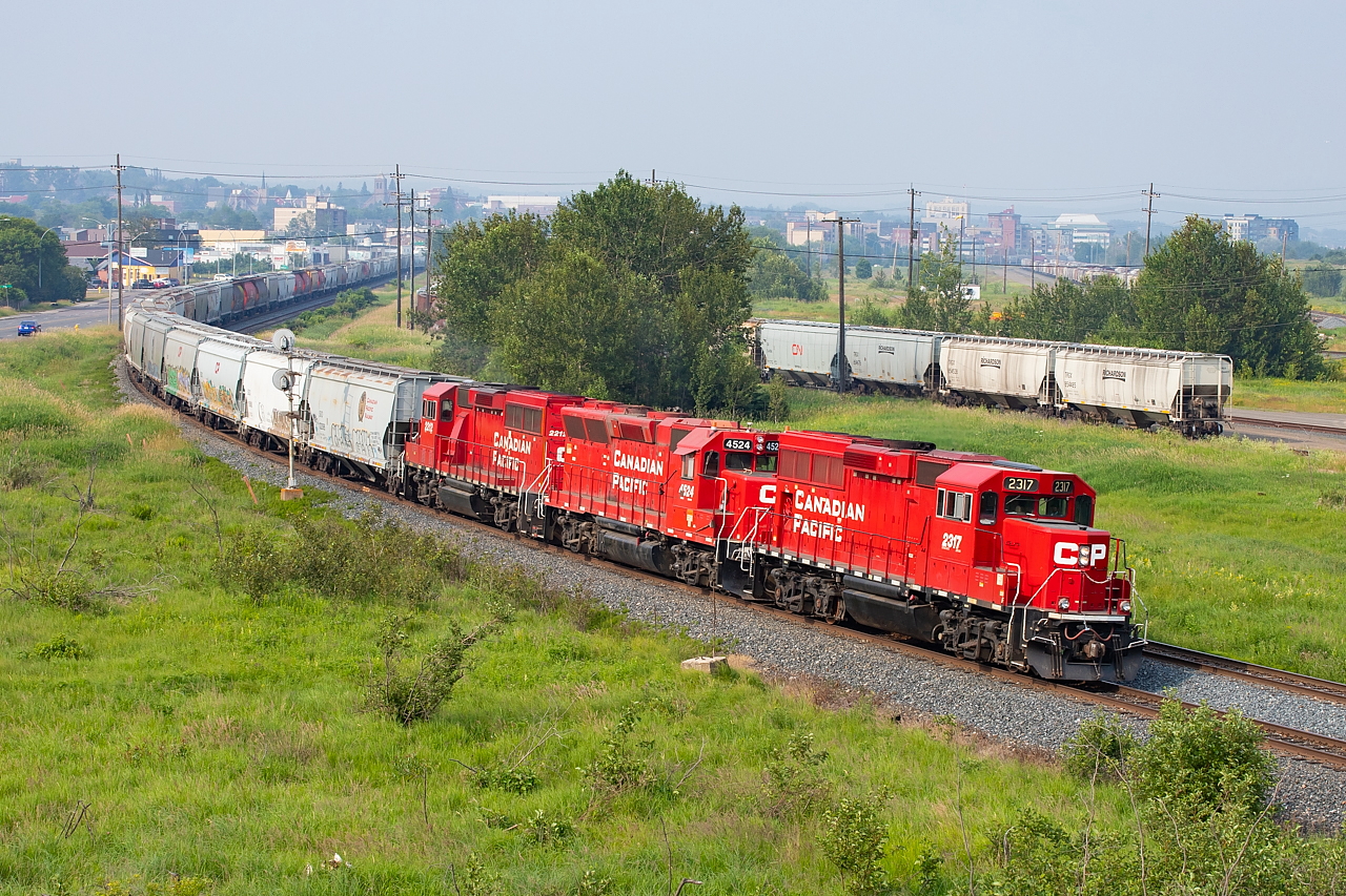 Caption: The sun is doing its best to fight through drifting forest fire smoke as CP 2317 leads for the 1559 Yard Job as they head westbound on the north track of the Nipigon Sub with a pull of empties from the Richardson elevator in the Current River area of Thunder Bay. The signal protects the diamond with the CN Kashabowie Sub, movements over which are controlled by CN RTC.