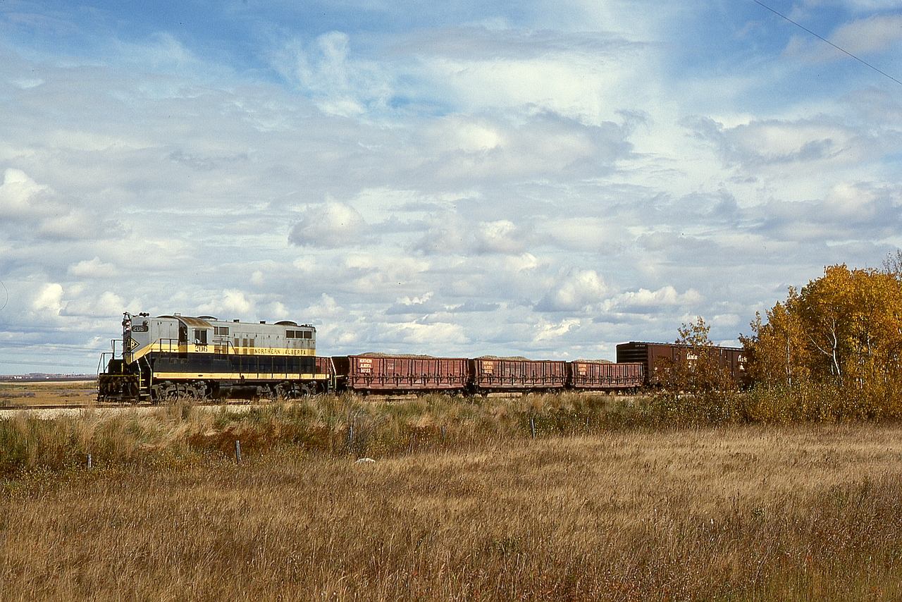 Caption: Westward from Grande Prairie, AB, the Northern Alberta Railways line to Dawson Creek, BC, travelled through numerous small communities, the first being Dimsdale, and this view is a few miles east of there at mileage 54.8, providing an ideal picturesque prairie branchline scene with good lighting for the Monday, Wednesday, Friday passage of train No. 51 westward from Grande Prairie, seen here with GP9 206 on Wednesday 1977-09-21, just a normal day in the paradise that is the Peace River region in autumn. A single GP9 running short-nose-leading was always a magnet for me and my cameras.