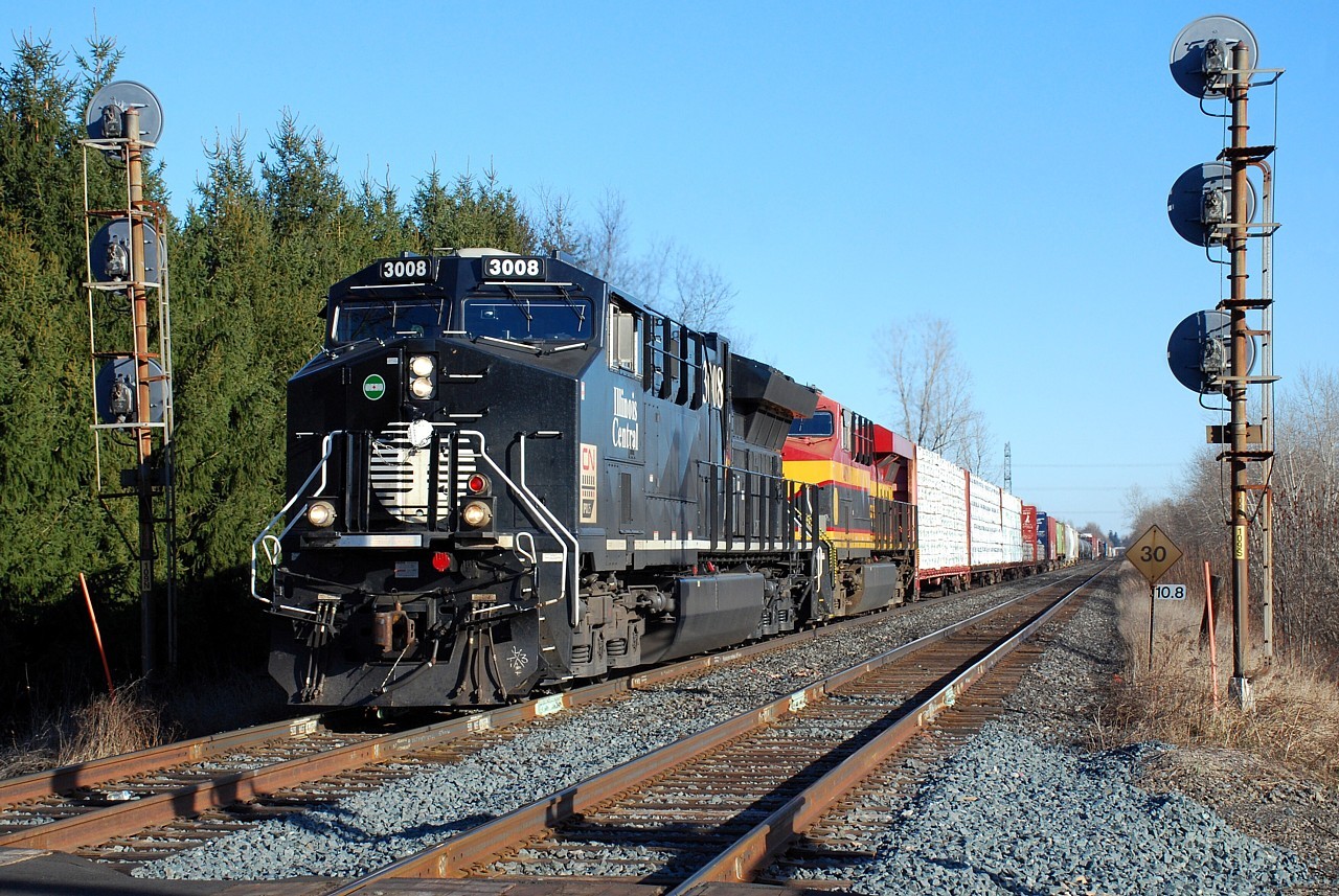 Caption: For the third time in just over a month, CN 3008, the Illinois Central heritage unit, led a train on the Dundas Subdivision. Today it was paired with KCSM 4871 on CN 397, seen splitting the signals at Copetown West as they get back up to track speed after climbing Dundas hill.