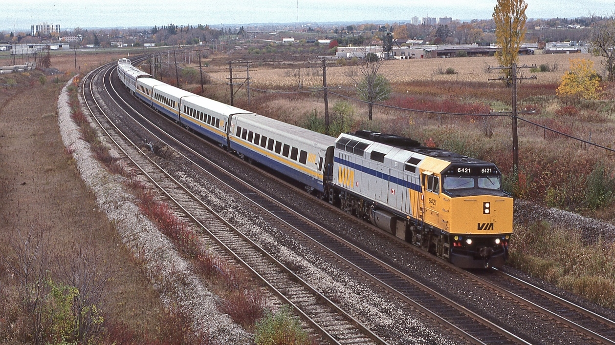 VIA 64 powered by 1987 built GMD F40PH-2D #6421 traverse the mile 304 speed restriction on the North Main with the usual consist plus ex CP equipment on the tail end : two Budd baggage, a Manor and Skyline 504