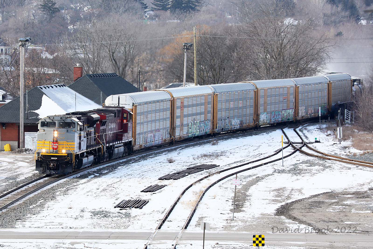 Caption: Social Media has deteriorated to the point where it is almost intolerable. But without it, I would never have learned that 7019; which seemed to have disappeared in Windsor, was now leading a very late running 234. With about 2 minutes to spare, I caught it running through downtown Galt, passing the iconic train station. Not quite sure how all the snow got on the bridge.