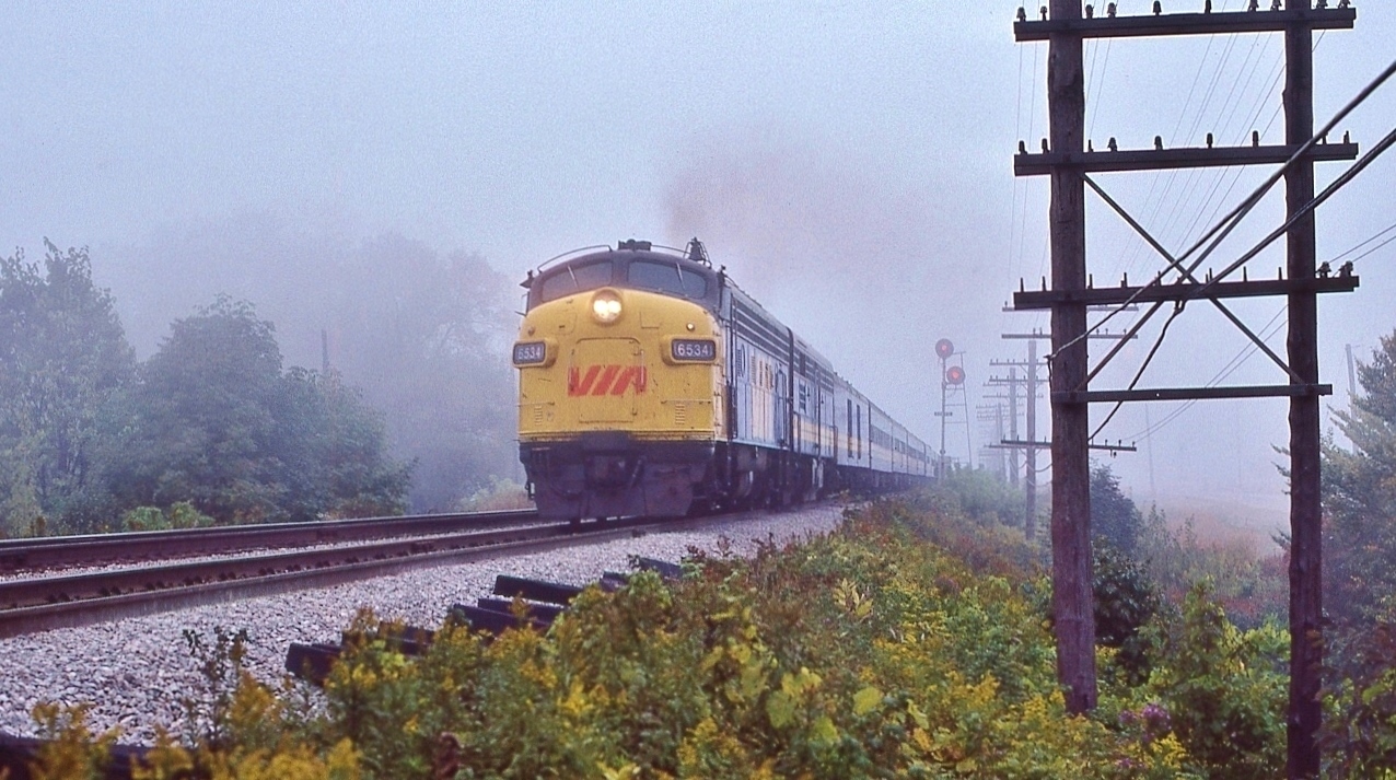 VIA #62 RAPIDO approaching the Rouge River bridge, October 6, 1979 Kodachrome by S.Danko