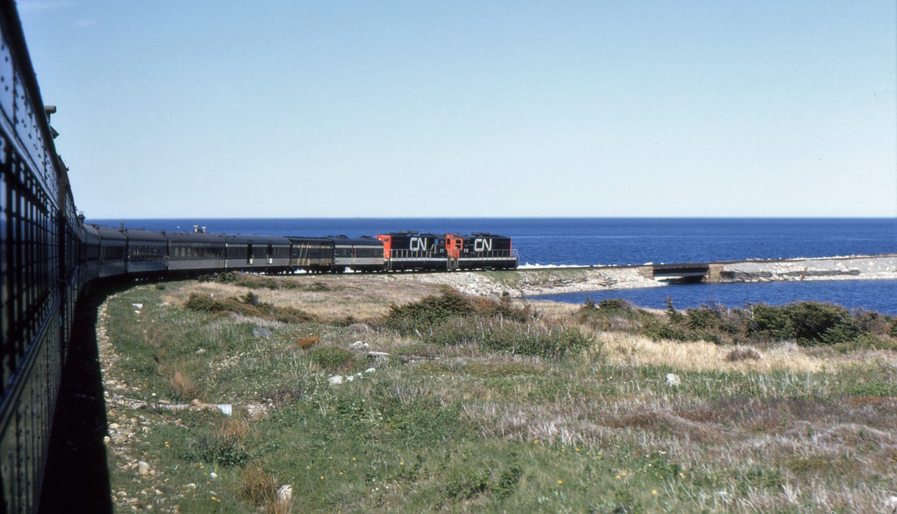 Caption: CARIBOU CROSSING - Travelling with four University of Toronto friends - including the late James A. Brown - to celebrate Canada's Centennial by riding Newfoundland's endangered passenger train 'Caribou', John Freyseng of Ontario was able to capture some amazing narrow gauge images. Here he photographs CN Train No. 102, the eastbound Caribou with NF210's 919 and 911 about to cross one of the 131 bridges at Bear Cove, just an hour into its 22-hour, 547 mile journey to the provincial capital of St. John's. Besides the two units, this train had a steam generator unit, express boxcar, baggage, cafe car, four coaches, diner and four sleepers. During World War two, engines crossing Bear Cove Bridge, had to extinguish their lights for fear that U-Boats patrolling in the Gulf of St. Lawrence might torpedo the abutments, thus shutting down the mainline. Just two years later on July 2, 1969, the Caribou would cross this bridge for the last time. This and other 1967 John Freyseng photos can be seen in my upcoming TRAINS OF NEWFOUNDLAND, to be released by Flanker Press in both hard and softcover editions on September 9, 2022.