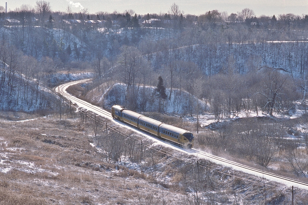 The Location: near Bala Sub mile 7, passenger train speed limit through the sharp curves: 35 m.p.h.; at lower left is a former East York works land (garbage dump) fill site (accessed from Northline Drive), East York Parkview Hills bungalows at upper left, the Flemingdon Park golf course is just out of view at extreme at right, at extreme upper left is the single tall (1971 built) exhaust stack for the Richard L. Hearn Generating Station (operating 1951 to 1983) at 44 Unwin Avenue located on the Toronto Port Lands