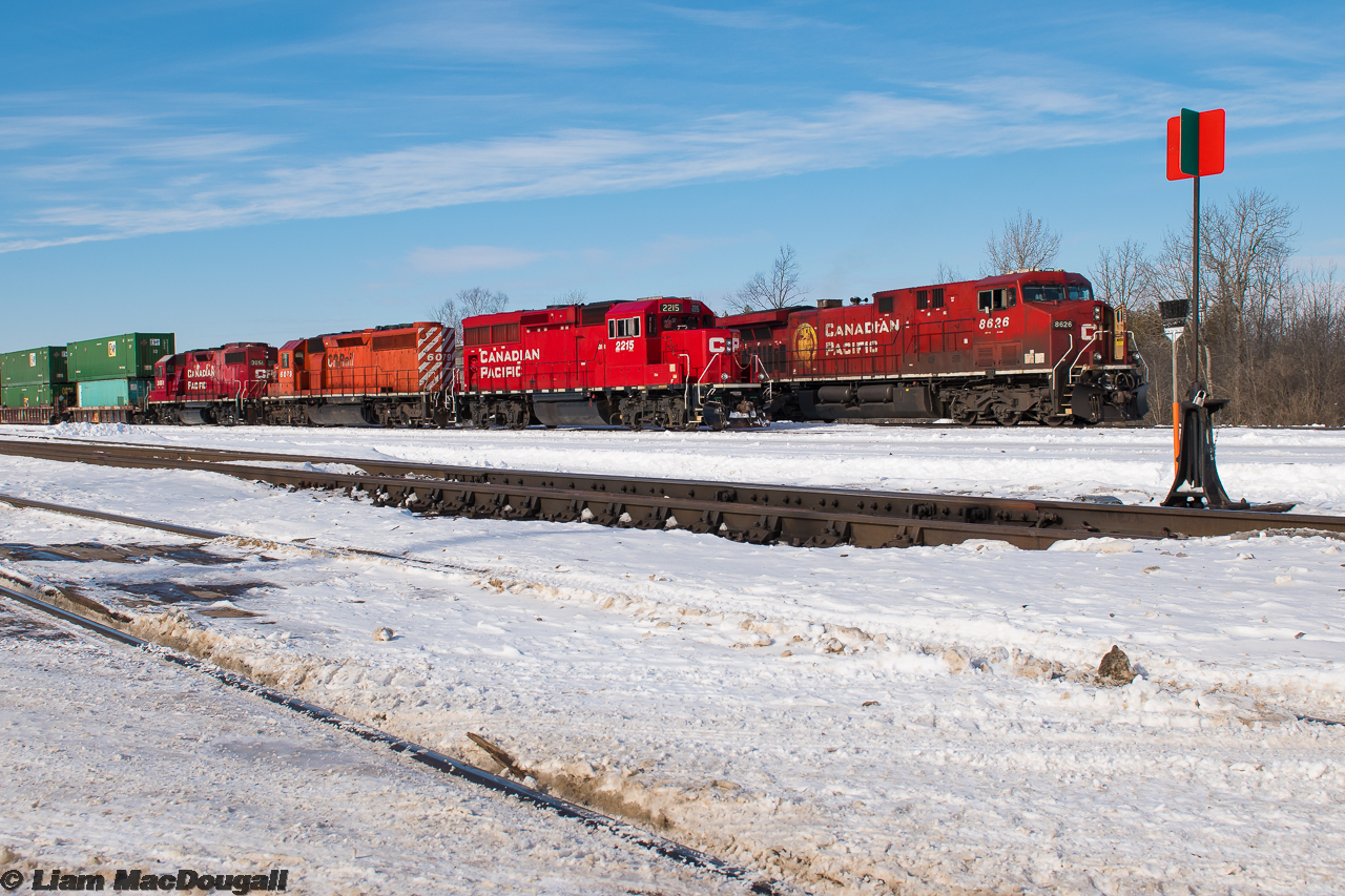 Here we see CP 9-118 and F55 beside each other at the east end of the yard in Smith’s Falls, Ontario. A trip was made out this way following word that a CWR would be running westbound with the SD40 pictured here at the helm, and a pair of KCS units that were dropped the previous night by 143. Upon arrival at the falls, we were surprised to see that the F55 crew had hooked their GP20ECO up to the aforementioned SD40 and were doing their day’s work with it. We knew F55 is the ID for the Omya (Glen Tay) turn, so we stuck around waiting to shoot the classic multimark GMD leading west on the job. Unfortunately, the waiting did not pay off as after they had built their train, they dropped the 40 and ran to the Omya plant long-hood-forward with their ECO unit…. Effectively, it was a day and upwards of $90 on gas money wasted.