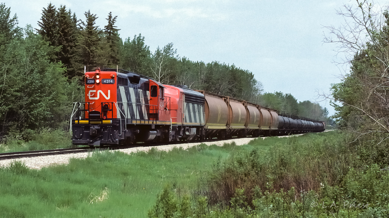 Caption: Some history leading up to this photo. On Wednesday the 29th at 10:40, 836 came limping into Redwater with the 4606 and 4294 and took the siding. After stopping, the reason why 836 was struggling became apparent, the 4294 was dead. If you can imagine, within a few minutes, the 4606 is burping and stops, out of fuel also. You can hear the conversation on the section radio. Diesel fuel is ordered and put in. Meanwhile, a unit train of sulphur empties go by heading north at 11:10 with 9159, 9194 and 9164. Next at 11:40, 584 heads out with 1082, 1075 and 1081. Those pair make a nice fill in while the units are being refueled :^). Finally at 13:10 they start them up, but, only the 4606 will run. At 13:20, decided to go home. A half hour later they are back, still having problems. At 15:00 they left and made it to Edmonton. At 19:00 a new 836 and crew come rolling through town. They now have the 4314 and 9108 for power. This photo shows the 4314 returning on Thursday at 15:25 as the extra approach's Kerensky siding.