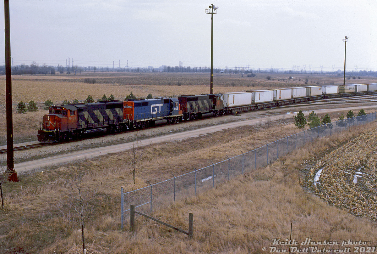 CN GP40-2L(W) units 9401 and 9410 bracket GTW GP40-2 6409 on a Laser intermodal train, working the north end of CN's Brampton Intermodal Terminal at Queen Street (Highway 7) in Brampton.Surrounding the terminal is farmland, once all part of rural Chinguacousy Township before the satellite city of Bramalea was envisioned in the late 1950's to build up a new suburban enclave northwest of Toronto and east of Brampton. Residential neighbourhoods and industrial areas sprung up throughout the 60's and 70's, and in 1979 the new Brampton Intermodal Terminal opened on the east end of what is now amalgamated Brampton. The surrounding area has since been developed and built up so much that CN can't expand BIT further, and has been looking to nearby Milton to build another intermodal terminal.Keith Hansen photo, Dan Dell'Unto collection slide.Entering the south end of BIT: http://www.railpictures.ca/?attachment_id=44628At the Halton Sub: http://www.railpictures.ca/?attachment_id=40053