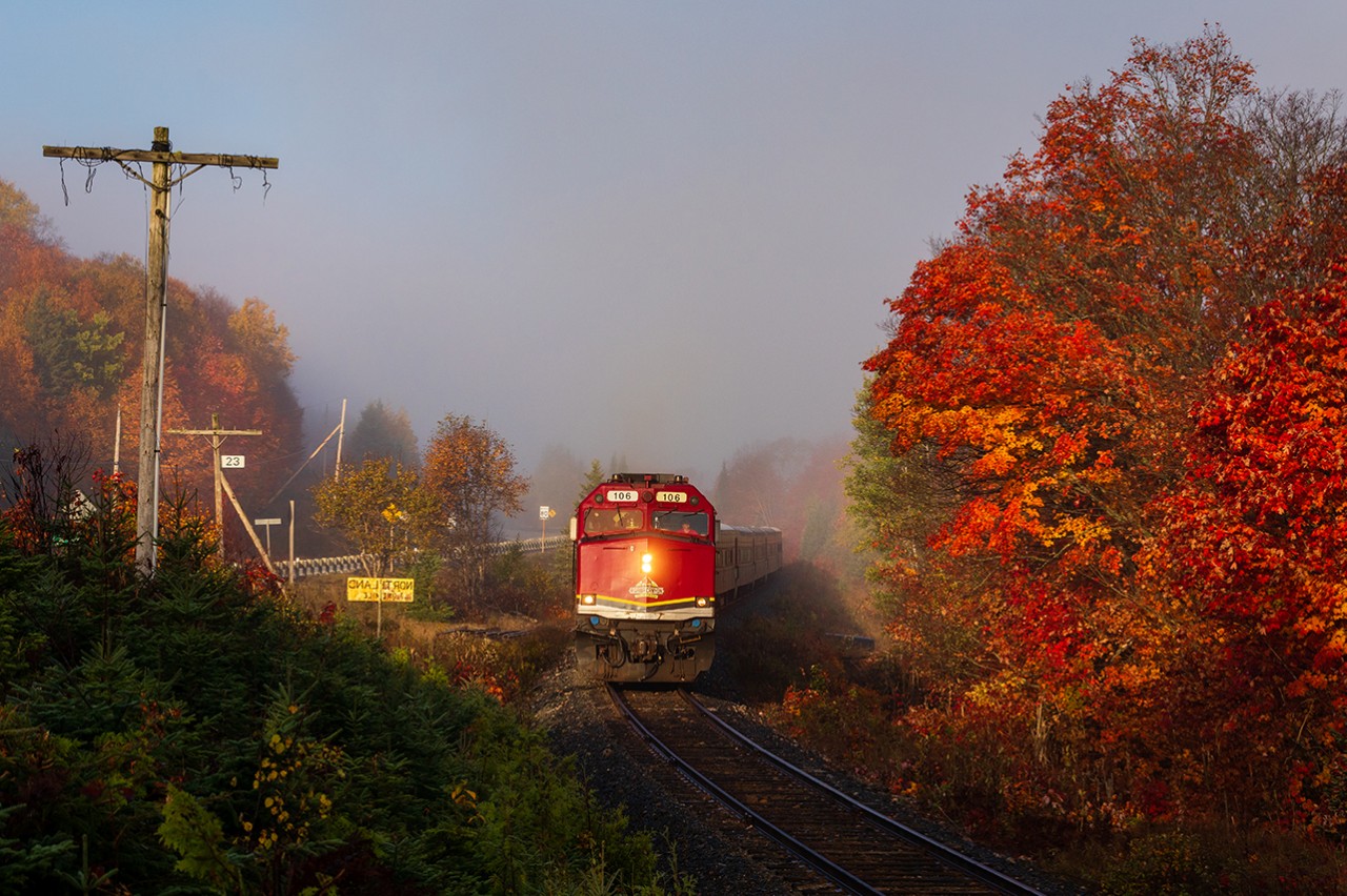 Caption: Early morning light, vibrant autumn colours and a layer of fog set the atmosphere at Northland, Ont., as Canadian National's Agawa Canyon Tour Train races towards "Canyon" on the former Algoma Central Railway.