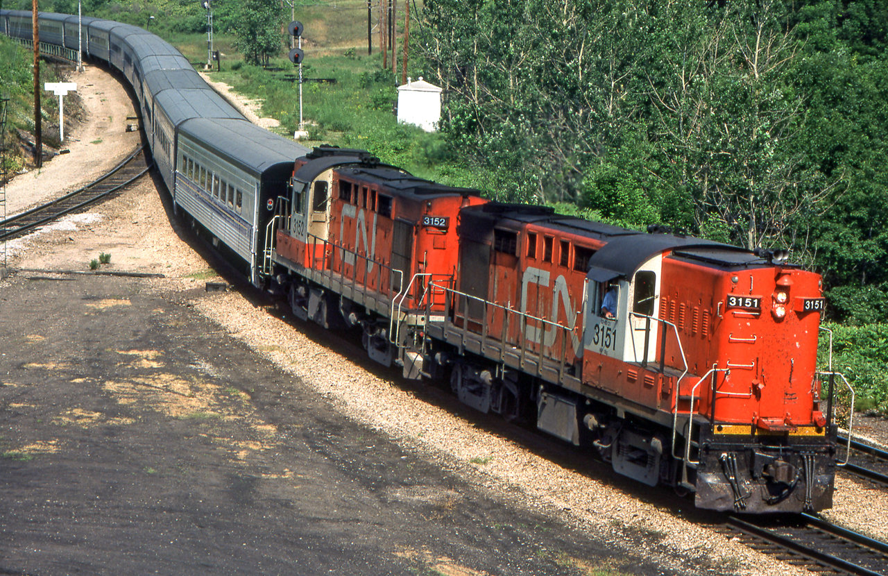Caption: An eastbound VIA Tempo train headed by CN 3151 is entering a super-elevated curve in Hamilton, Ontario in June 1981.
