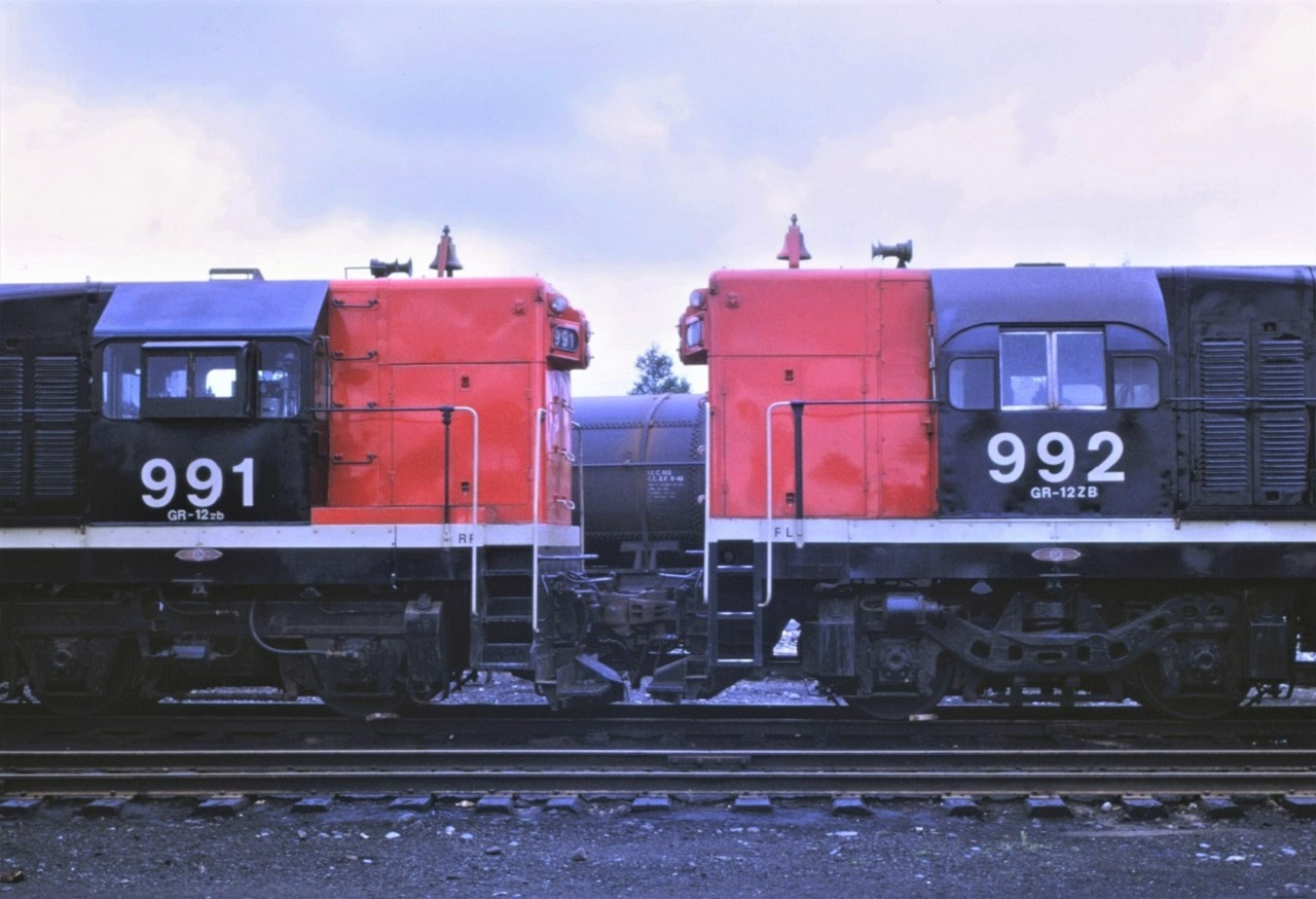 Caption: Just passing through!!! CN's two G-12s, 991 and 992, are shown in Capreol, Ontario on their way west to their new home on Vancouver Island. The units were built for the London and Port Stanley Railroad in 1955 and 1957. 991 ex L&PS L4 built 8/1955 b/n A832 (some sources show the b/n as A831) and 992 ex L&PS L5 built 7/1957 b/n A1324. Both units acquired by CN on January 1,1966 and retired in 1976 and scrapped. Of note are the different trucks and cabs on the units.
