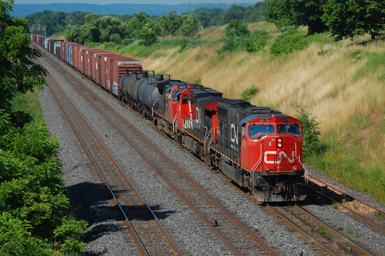 Caption: CN Eastbound with CN SD75I 5775 seen at Lemonville Rd.