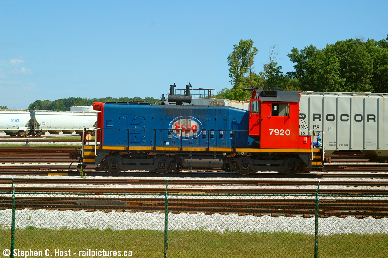 This was the only time I shot the ESSO Switcher in service in Sarnia, now LDSX 7920 and painted in GIO's tasteful grey scheme.. This unit was out of service not long after this picture was taken and sat at the LDS shop for about 10 years before it was finally repaired, repainted and put back into service. The Esso scheme was rather nice however.