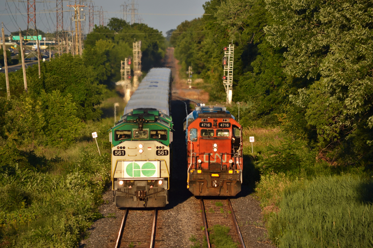 Caption: What looks like something out of the late 90's early 2000's, but happening in 2022 is pretty remarkable. After 581 made quick work of the Grimsby sub today, they ended up being held up at Nelles Rd for both the evening NF GO train, as well as Amtrak 698 with 717 leading. The delay led 581 to be in PL to say the least, as a bonus, getting the only F59 set running ( as I believe ) to be the only train set like this. Someone will correct me just how many F59's are left, but not many I am guessing.
