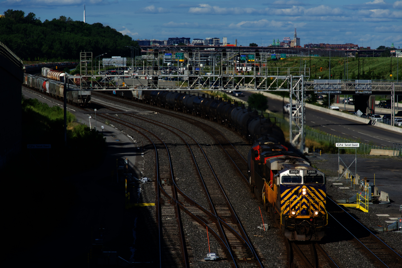 Caption: CN 321 has an ex-CREX leader as it crosses over from the South Track to the North Track at Turcot Ouest.