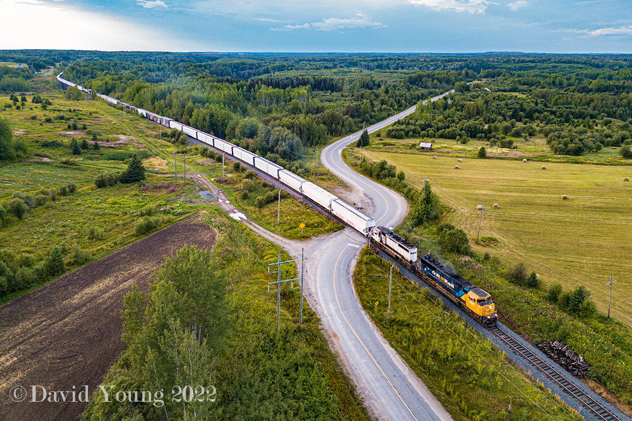 Caption: ONT 2103 and ONT 1740 head up heavy southbound tonnage on Cochrane to Englehart freight 414 as it thunders across Highway 572 just north of Ramore, Ontario.
