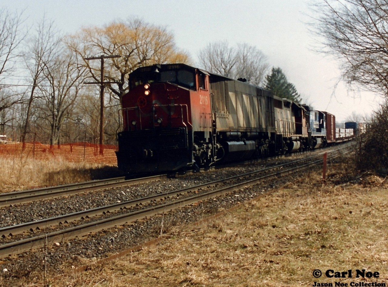 Caption: CN 2116, 9313 and Conrail 6580 lead a morning westbound across the large Grand River trestle in Paris, Ontario on CN’s Dundas Subdivision about to pass the site of the former Paris train station.