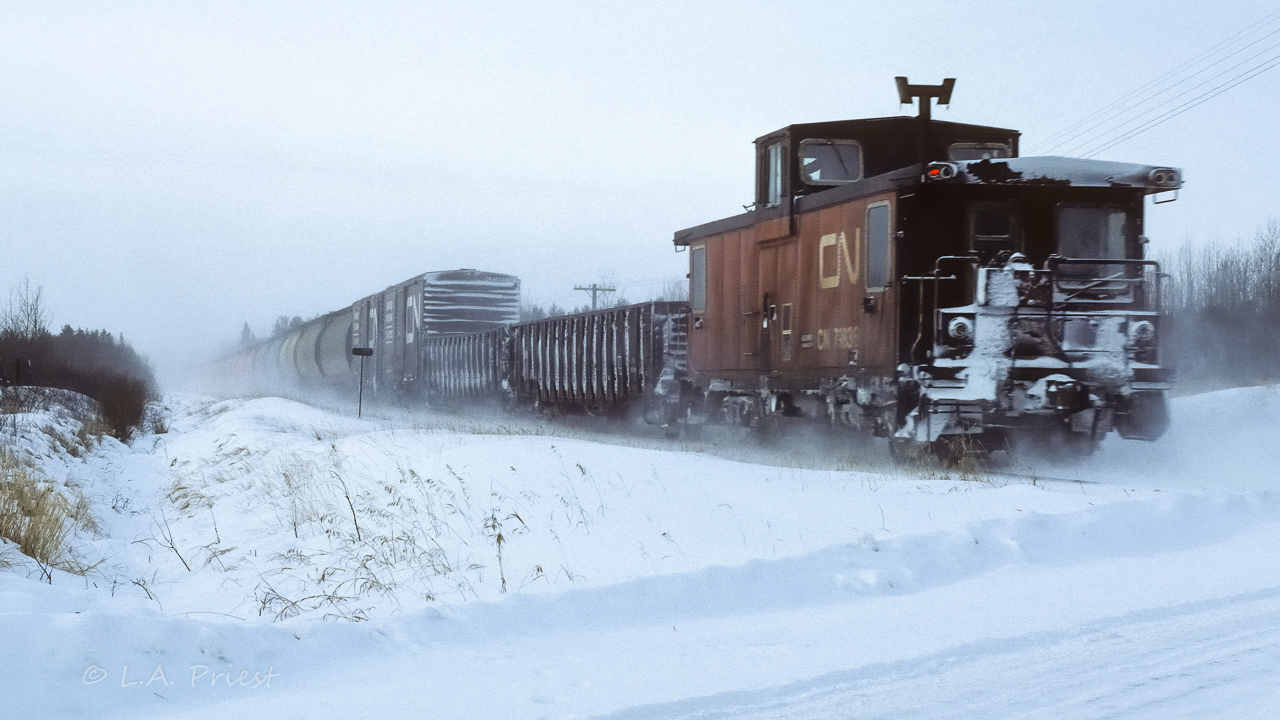 Caption: How nice it was to have a toasty caboose when working in weather such as this. The 5510, 4347 and 5506 have 40 loads of grain and some empty gons headed back to Calder yard. Photo taken at mile 23.8 at 10:40, shot at f11, 1/125 sec, with 50mm.