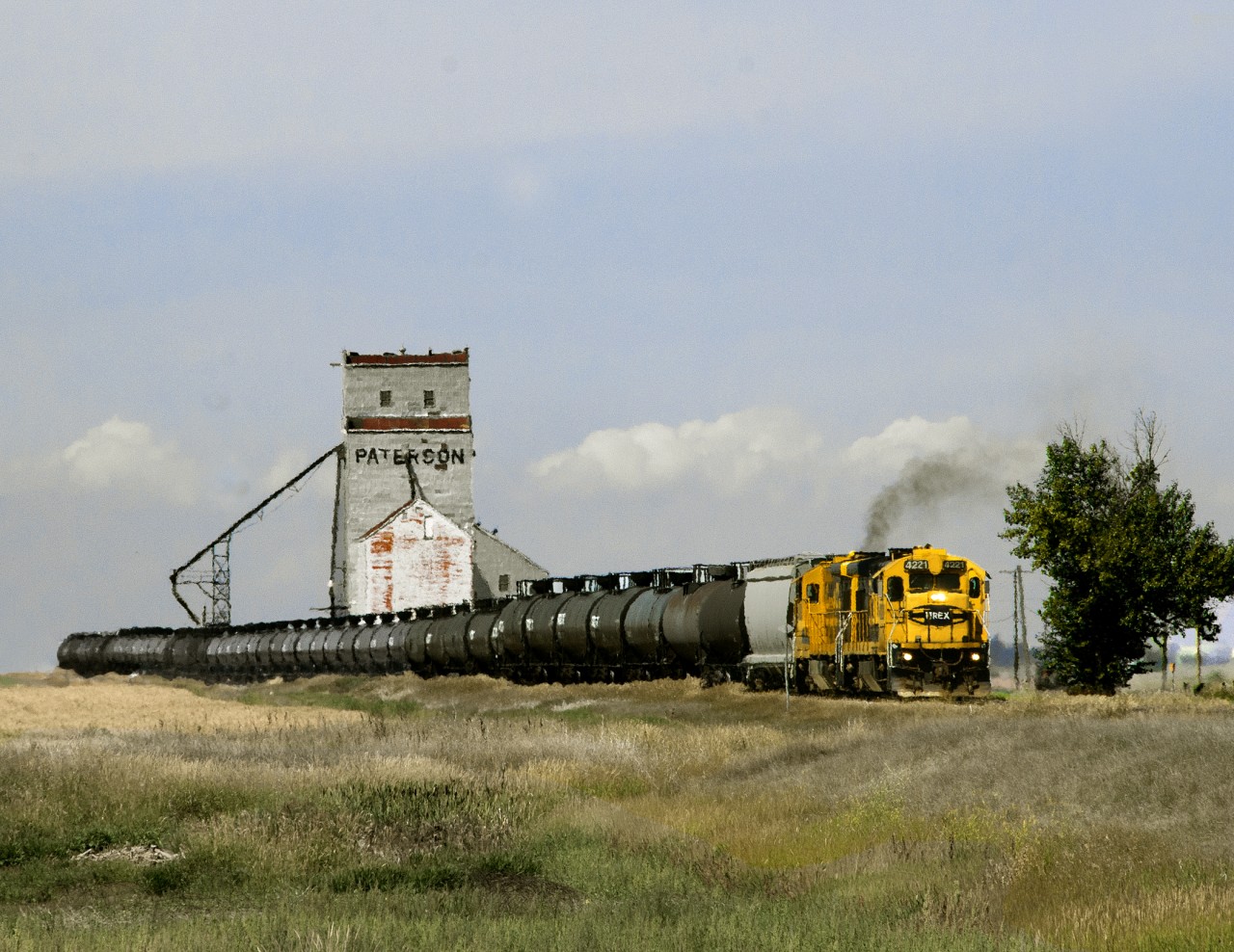 Caption: Great Sandhills eastbound from Home terminal of Leader to Swift Current with leased NREX power still with Santa Fe Colours passes the wooden elevator at Prelate on The former CP secondary line from Swift Current to Bassano. The tank cars are a combo of LPG loads from the Empress gas Plant near Burstall and the empties out of storage