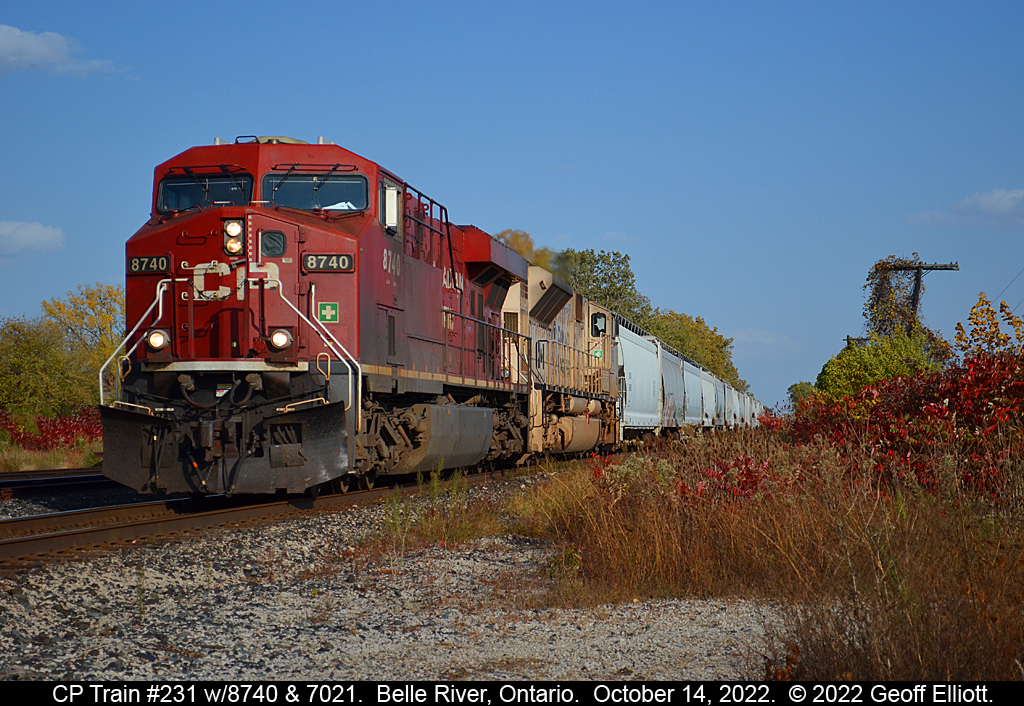 Caption: CP train #231 rolls through Belle River, Ontario on October 14, 2022 with CP GE #8740 and CP SD70ACu #7021. The crossing signals activated as I crossed the tracks so this was a 'bail and shoot' situation that turned out reasonably well.