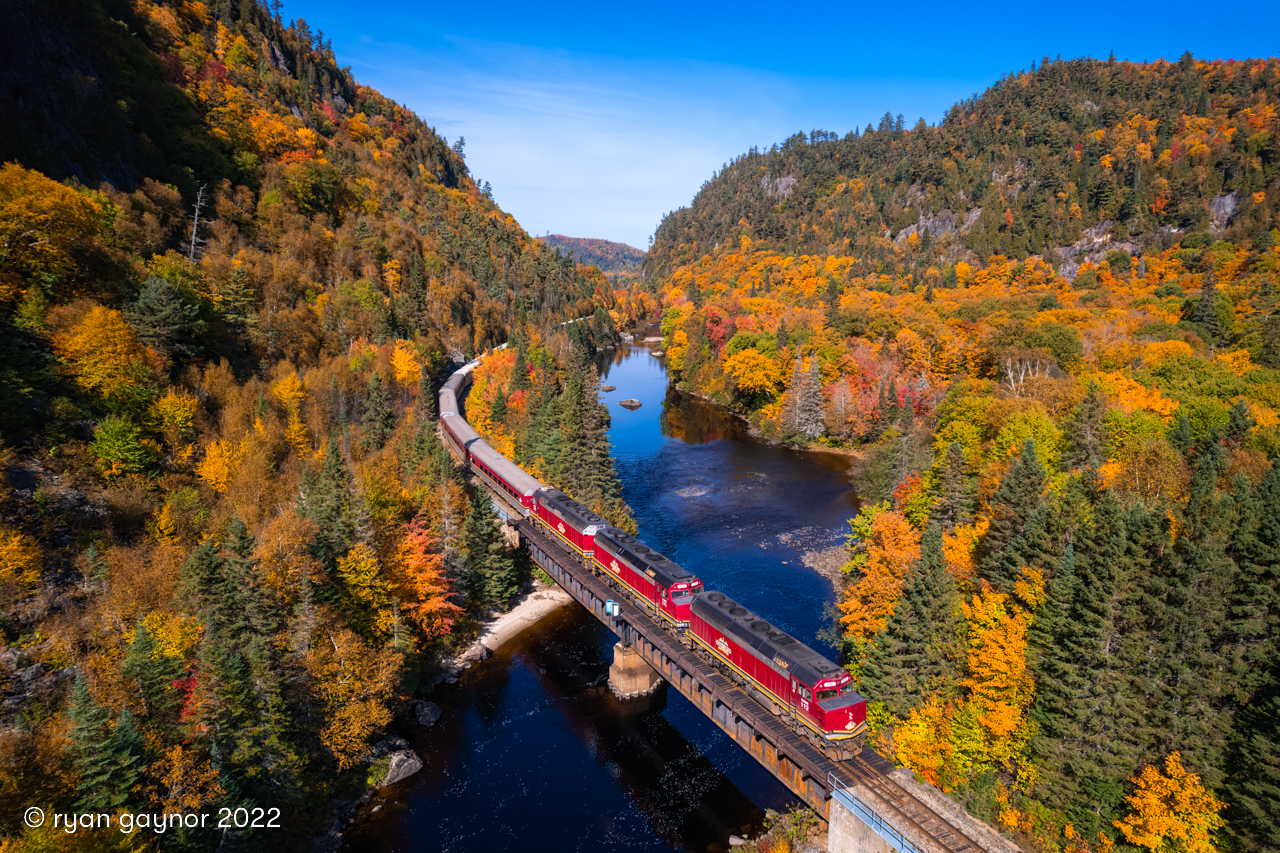 Caption: Emerging from the Canyon under spectacular autumn skies, a trio of EMD F40PHR locomotives hustle Watco's sold-out Agawa Canyon Tour Train over the Mile 112 trestle on the "new ACR". In February 2022, Watco purchased the old Algoma Central line from Canadian National, tastefully naming it the Agawa Canyon Railroad and resuming tour train operations for the world to enjoy. On this day, 846 passengers from around the globe were able to take in the autumnal splendour of Agawa Canyon; the crown jewel of Algoma Country.