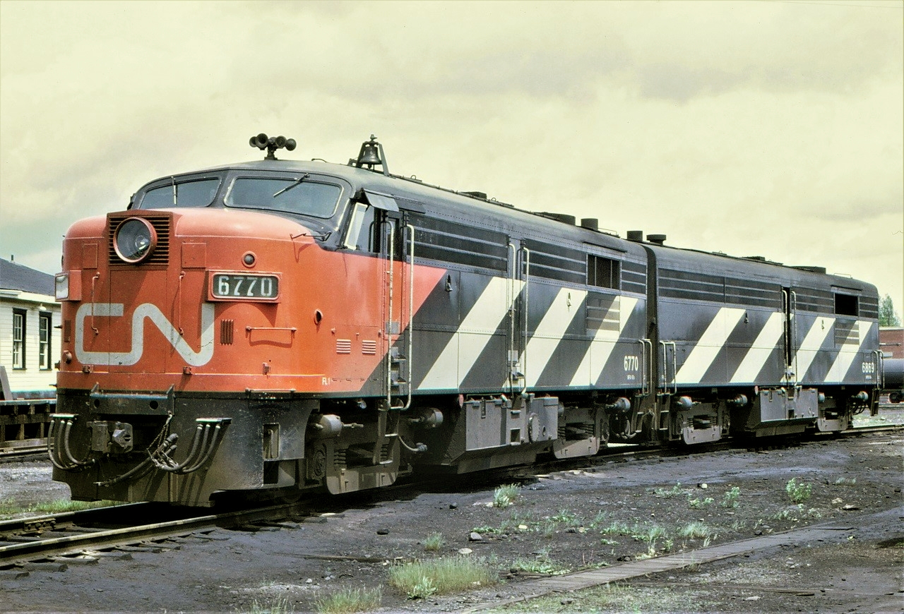 Caption: A matched pair of CN passenger units, FPA4 6770 and FPB4 6869, rest on one of the shop tracks at Capreol, Ontario on June 17, 1969 after bringing the Toronto section of the Panorama into town. The units will be turned and head back to Toronto that night on the Panorama.