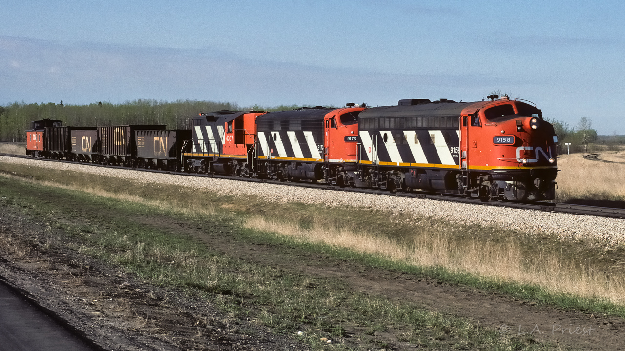 Sorry Paul, I should have been more clear, this is an empty unit train of sulphur hoppers on the way up north. They will back the next afternoon with 35 loaded ones. You are very correct about the grade. The connecting track in 1985 was at most a couple of years old. The construction of the connecting track allowed the abandonment of many miles of 60lb rail on the Lac La Biche Sub.