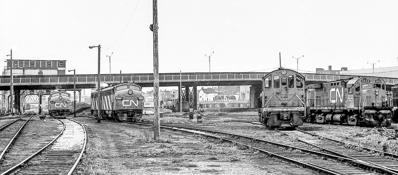 Caption: It is mid-June 1970 at the CN Spadina engine facility in Toronto. CN 3232 and others can be seen.