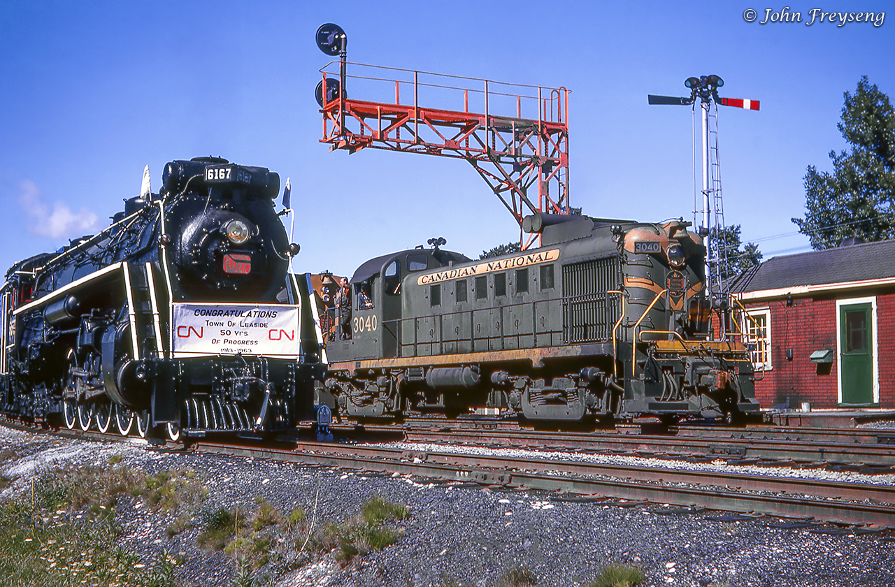 Caption: CNR 4-8-4 6167, running light as extra 6167 to Leaside CNR (ex-Canadian Northern) yard for public display as part of Town of Leaside 50th anniversary celebrations (incorporated April 23, 1913, population 47), and will be departing over the CNR Leaside Branch; former Canadian Northern connecting line to CPR Trenton Subdivision (today CP Rail Belleville Sub) and CP trestle over Eglinton Ave East and Don River West Branch valley into the CNR Leaside yard.