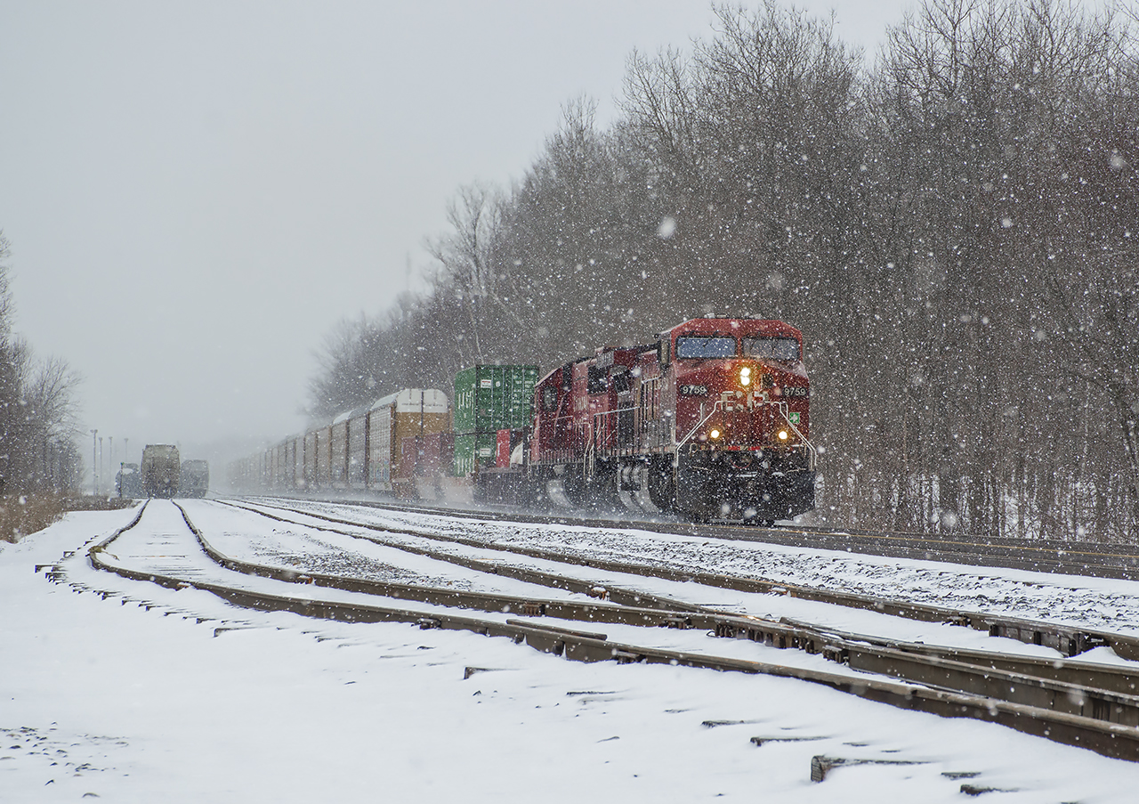 Its climb up the Niagara escarpment complete, CP 235 picks up speed through Guelph Junction.