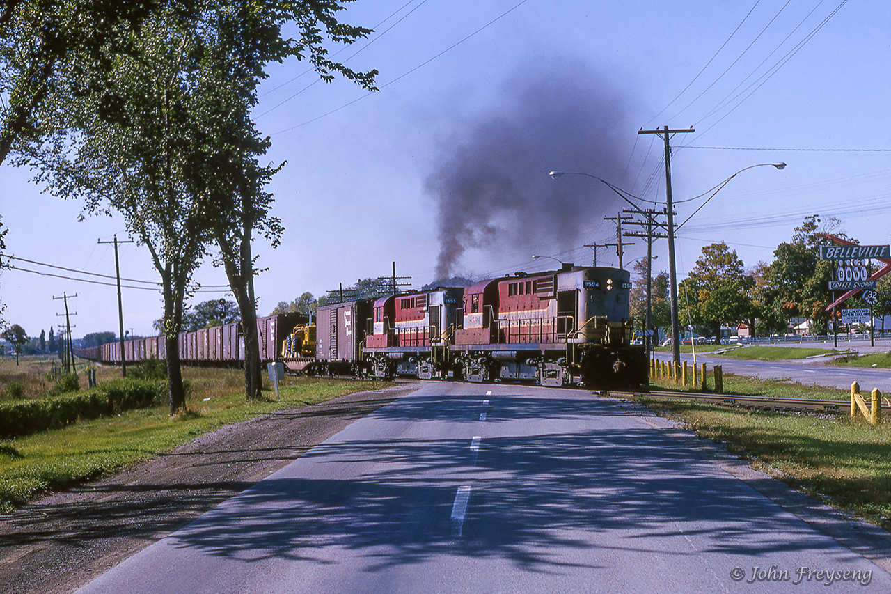 Long hood forward, just as MLW intended….love those roadswitchers RS-10s, and at the divided highway #2 road crossing…
