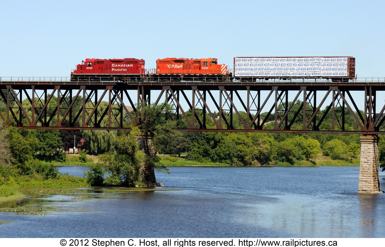 Caption: After a recent IOP change under CP's new management, the Guelph Junction Turn, formerly known as the London Pickup trundles across the Galt bridge with CP9's 8250 and 8239 with lumber for Dumfries , Ontario. The train also had work at Ary and Wolverton en-route to finish at London Yard.