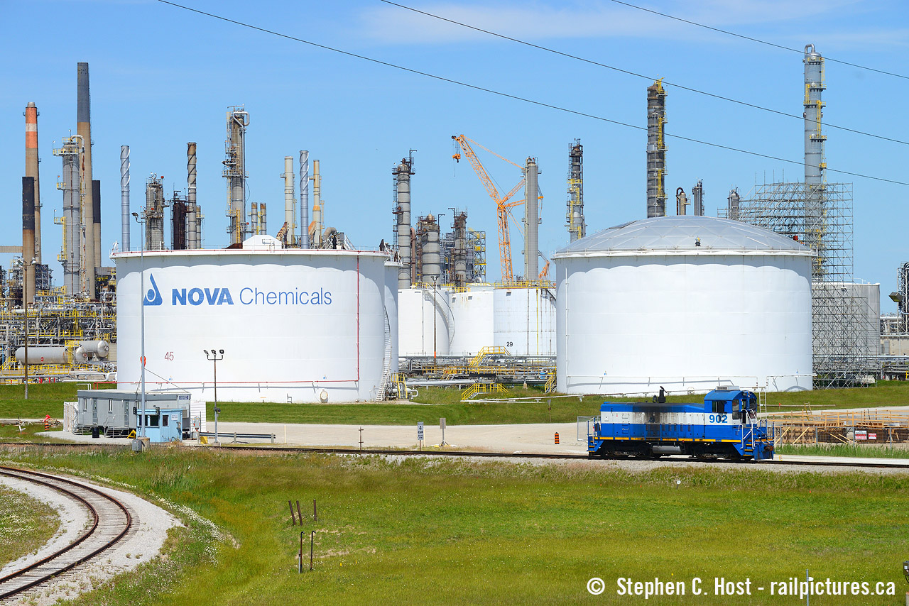 Caption: Nova 902, a nice SW900 still with original EMD number plate on the side sits at Nova Corunna between assignments. Two locomotives are normally assigned to Corunna but this is not it : 902 is used as a floater to go between Nova's three (at the time, now four) plants in town. Between these plants there are now 8 Nova locomotives in Sarnia, and all are assigned to the facilities directly except 902.