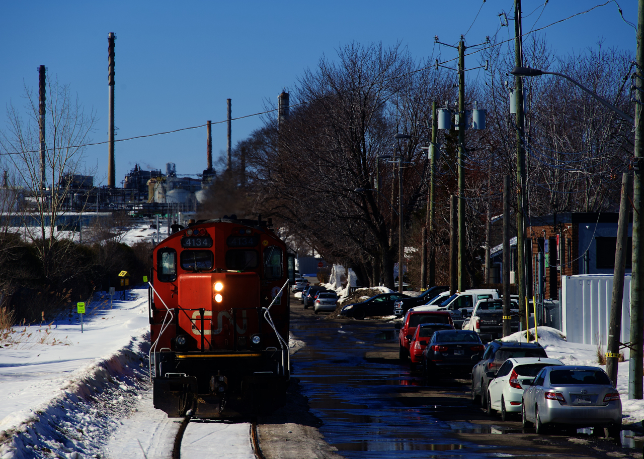 The Montreal East Switcher is heading light power to pick up empties at Bitumar. This spur closely parallels a residential street.