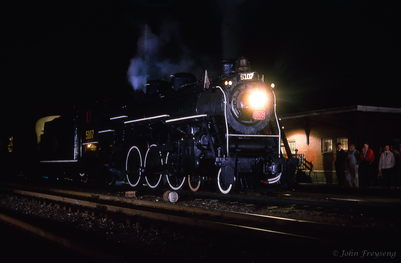 CNR 5107 is seen in front of the St-Hyacinthe station during the last water stop of the evening, giving photographers the opportunity for night shots. The six car train had departed Central station track 9 that morning at 0829h making a water stop here at St. Hyacinthe, as well as at Richmond, and three photo runpasts. One more runpast would be held between Richmond and Sherbrooke before turning the train for the return to Montreal, stopping for three more runpasts and water on the way. Back in Montreal, 5107 would be cut off at Bridge Street, leaving the consist in the care of MLW S4 8062 for the last couple of miles into Central Station. Today, CNR 5107 is on display in Kapuskasing. Bill Thomson caught 5107 at Mimico in the summer of 1958.