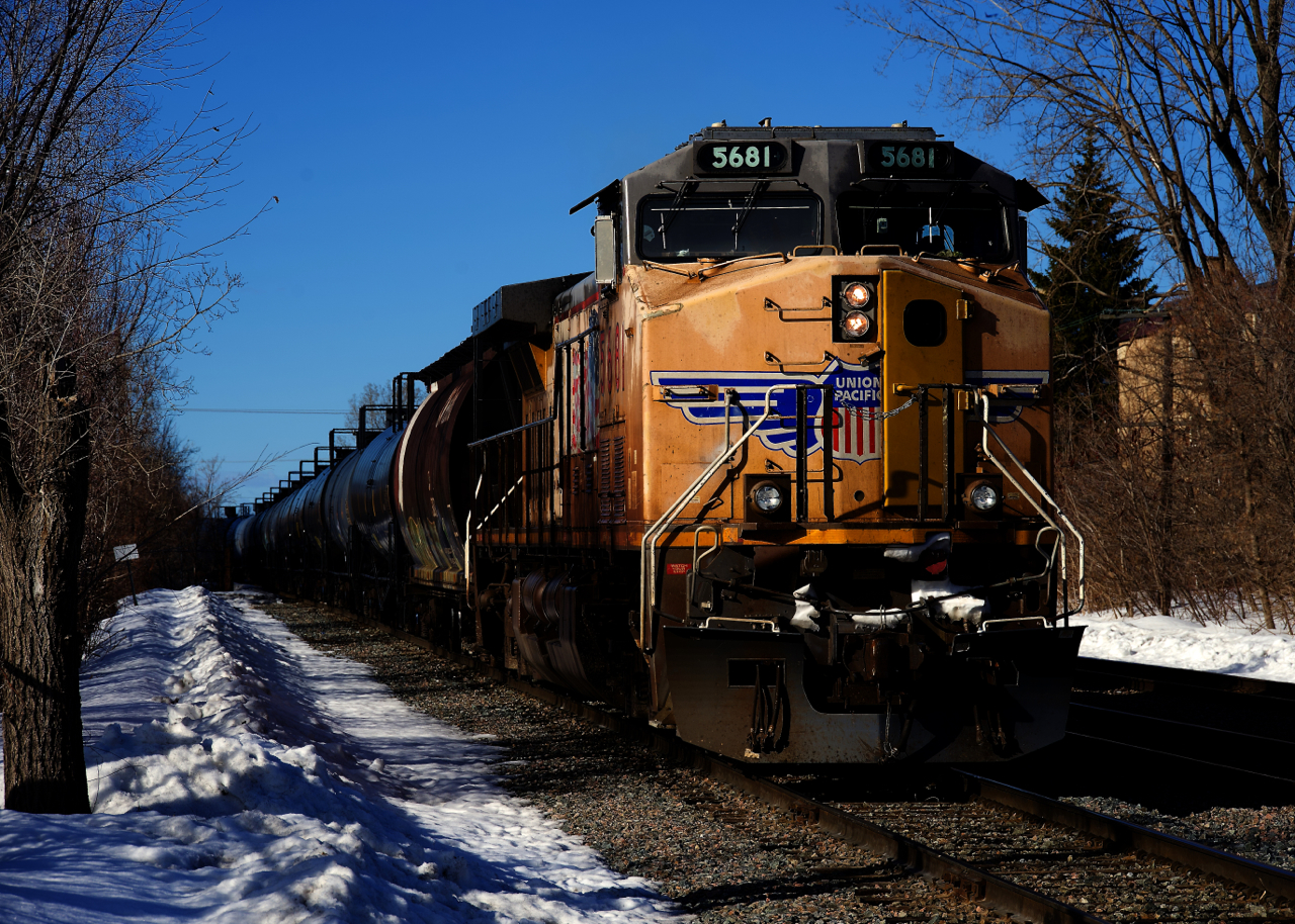 Caption: UP 5681 has a non-standard door and is seen leading ethanol train CP 528. It is stopped and awaiting a new crew at a spot known as Robbie Burns on CP.