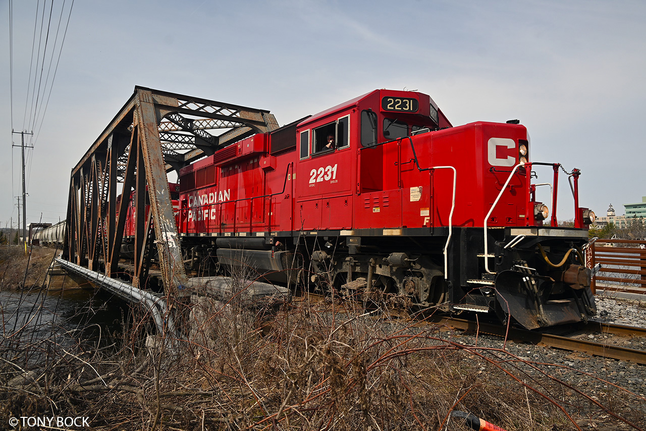 Caption: On its way to Havelock and Blue Mountain to serve the nepheline syenite mine, CP train T08 crosses the Otonabee River bridge (built 1913) in downtown Peterborough, on April 11th, 2023. Today's long train is powered by three locomotives, led by GP20C-ECO 2231.