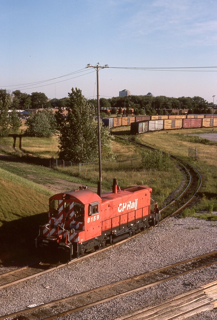 Caption: On a CP mechanical On-Line Failures team trip to Toronto in 1994, an amazingly hot evening walk from the hotel up Markham Road took me to the Finch Avenue overpass directly above the Toronto Yard station name sign, and not-yet-rebuilt SW1200RS 8159 passed below westward at an opportune time at 1904 EDT.